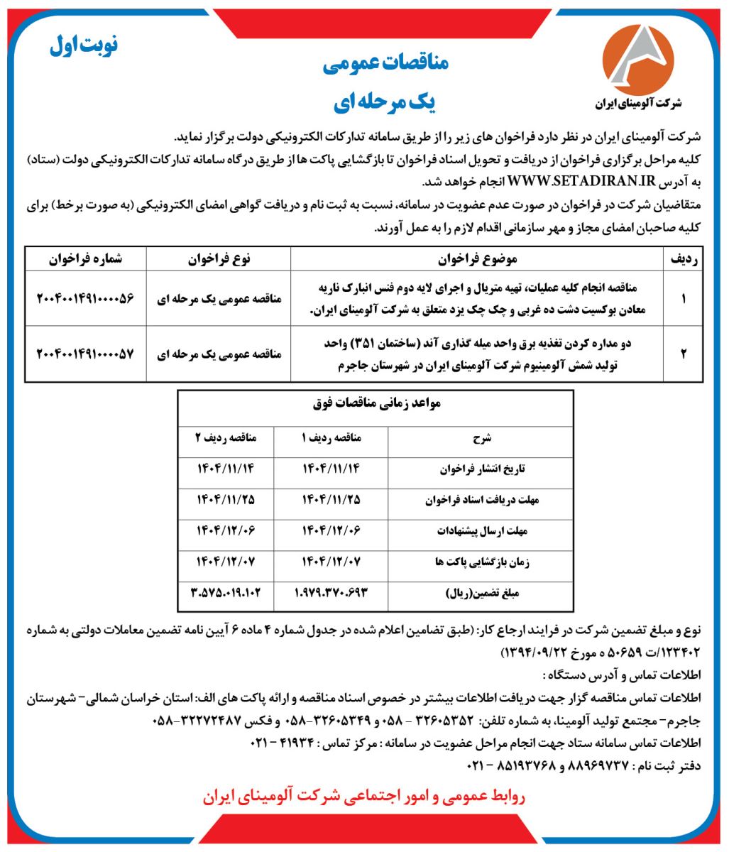 مناقضه عمومی آلومینا چاپ شده در روزنامه اترک