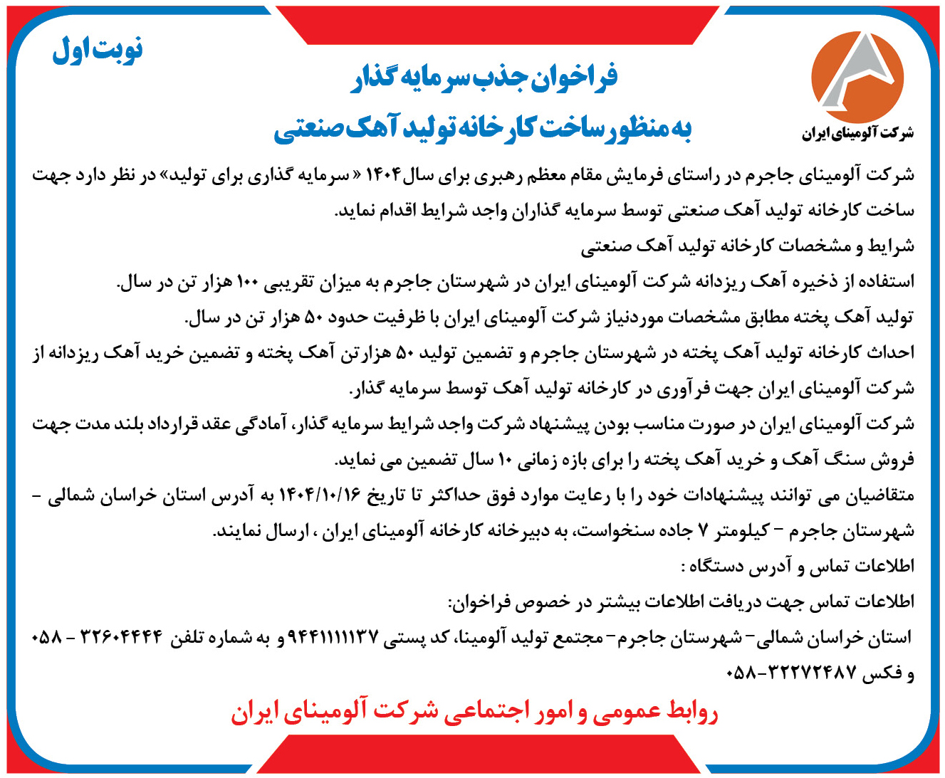 آگهی فراخوان جذب سرمایه گذار در شرکت آلومینای ایران منتشر شده در روزنامه اترک