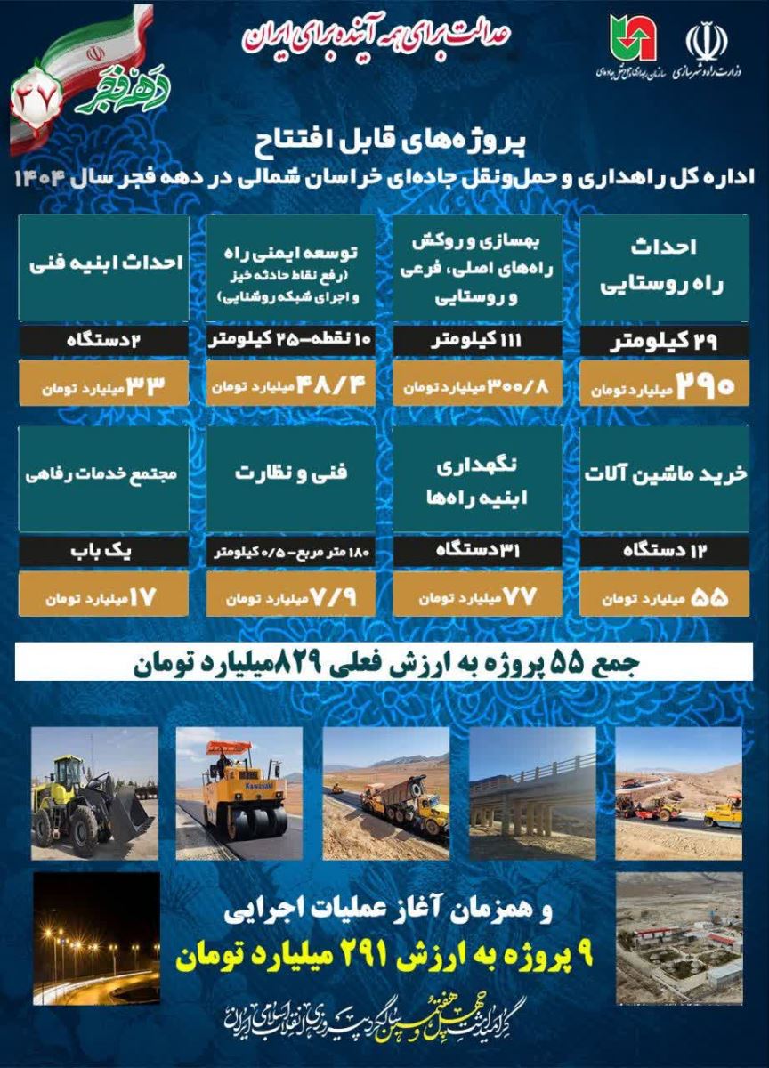 پروژه های قابل افتتاح اداره کل راهداری و حمل نقل جاده ای خراسان شمالی در دهه فجر 1404